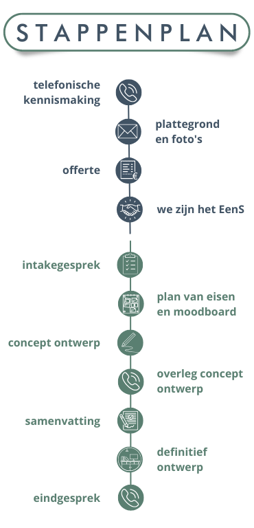 Je krijgt van ons een samenvatting van het intakegesprek in woord en beeld. Dit bestaat uit een presentatie met een plan van eisen en een moodboard.
